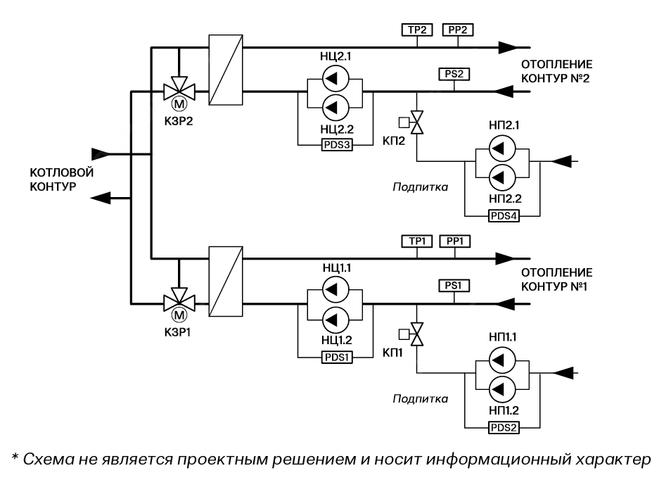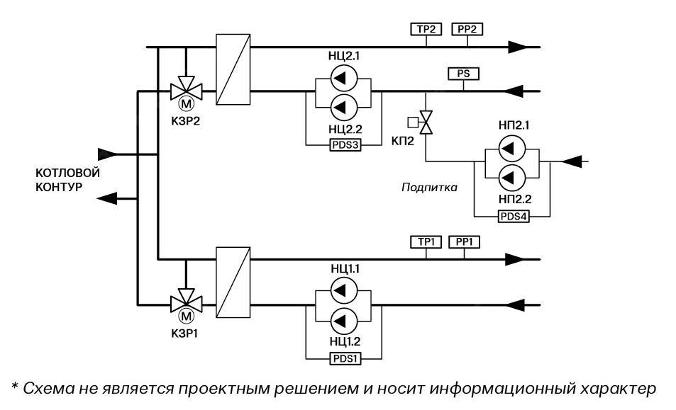• управление подпиткой контуров с помощью подпиточных насосов и клапаном подпитки;